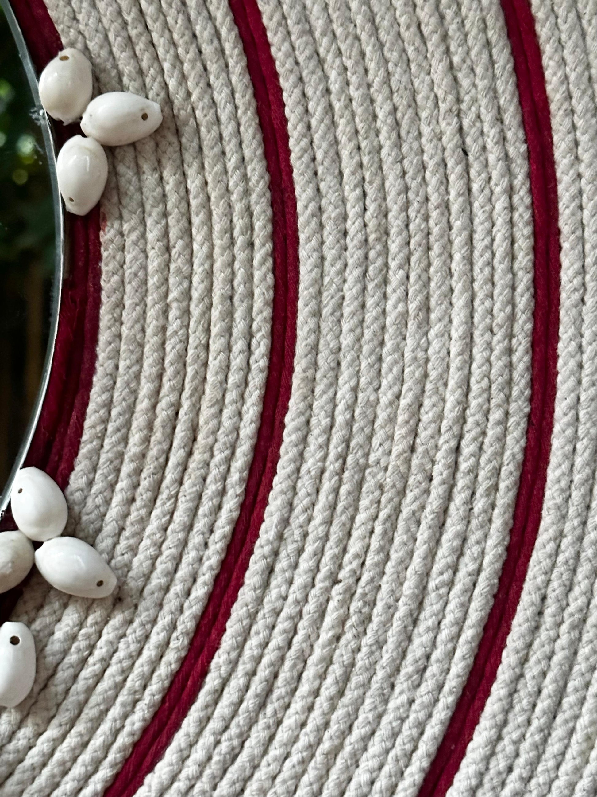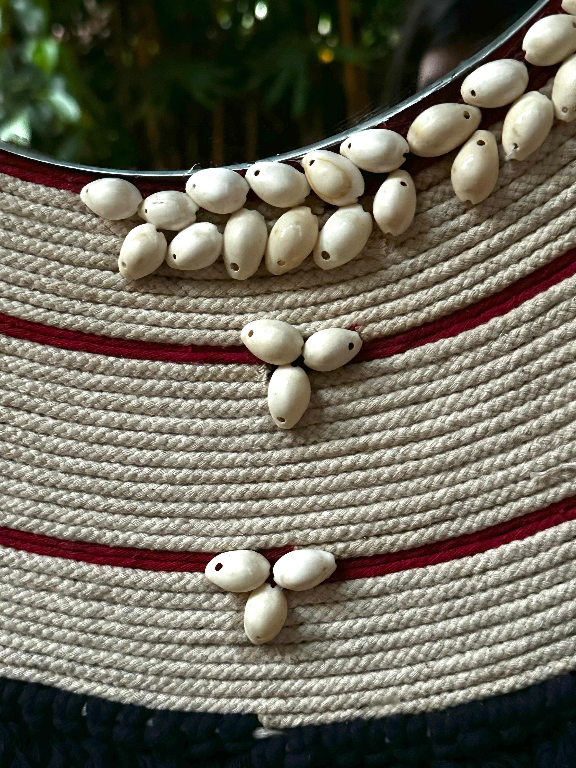 This conceptual mirror redefines Kerala's Pooram festival accessory in a contemporary, aesthetic style. Handcrafted with cotton yarn and sea shells, it creates a captivating focal point in any interior, blending traditional cultural elements with modern design.All Miral India pieces are hand crafted and unique.