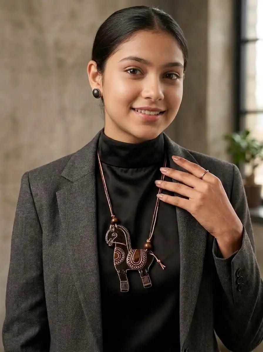This handcrafted handpainted horse pendant set will surely be a showstopper.Thisensemble features a stylized, elongated pendant and matching earrings. The deep finish is accented with delicate hand-painted golden patterns, evoking a stylish aesthetic that celebrates modern wearable art.